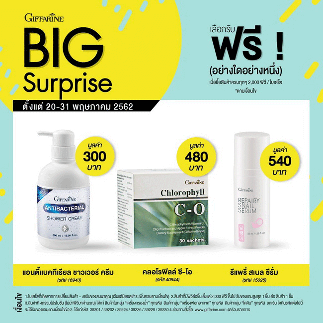 BIG Surprise กิฟฟารีน คุ้มใหญ่ไฟกระพริบ เลือกรับฟรี..!!! ผลิตภัณฑ์ยอดนิยมจากกิฟฟารีน เพียงช้อปครบทุก 2,000 พีวี/บิล* เฉพาะ 20-31 ตุลาคม 2562 นี้ ที่กิฟฟารีนทุกสาขา